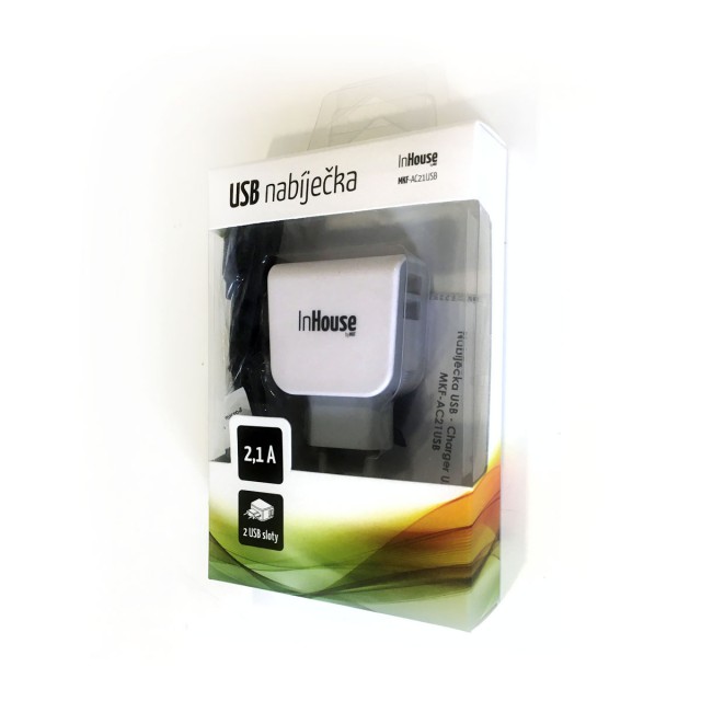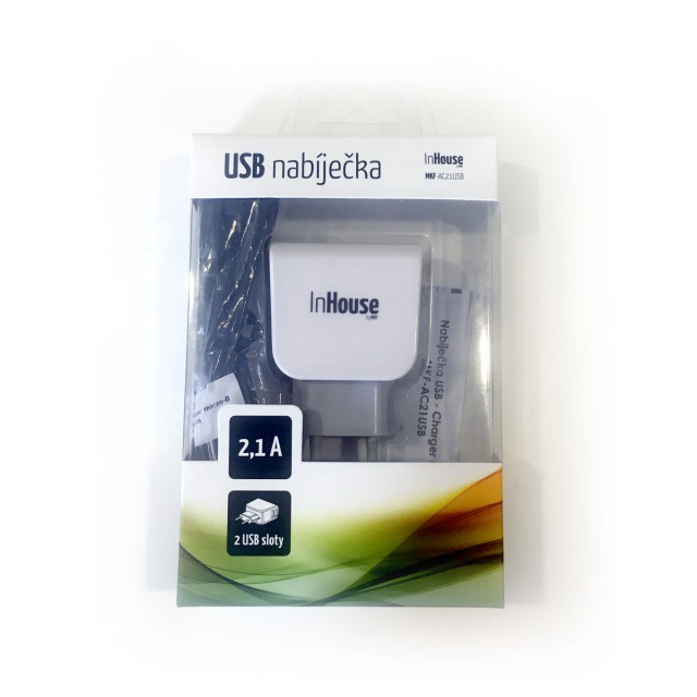 Volitelný, univerzální napájací adaptér nabíjačka pre rôzne zariadenia obsahuje 2x USB port s výstupom 5V / 2,1A (max 2,5A) + 1m USB na micro USB kábel