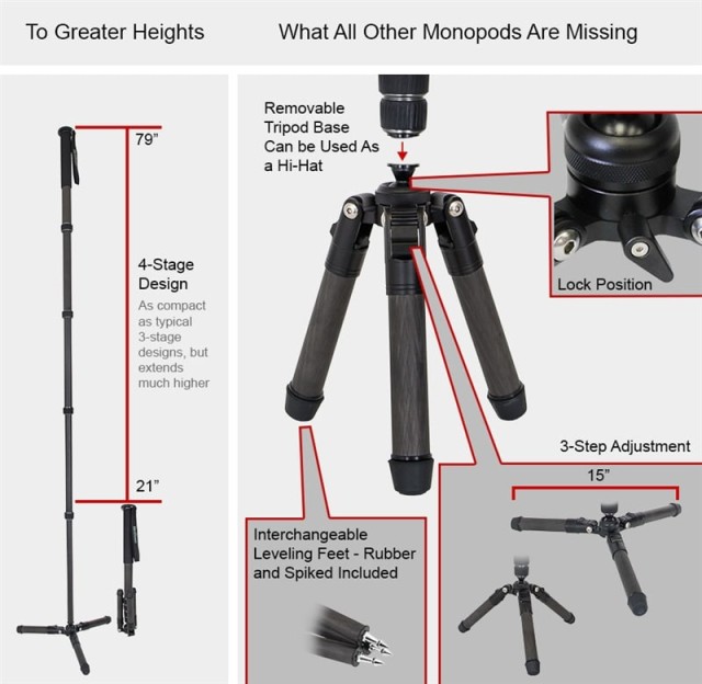 Hliníkový monopod VariZoom CHICKENFOOT-AL kombinuje prenosnosť tradičného monopodu s dodatočnou stabilitou statívovej základne. Vďaka ľahkej 4-stupňovej hliníkovej konštrukcii sa dá zložiť do kompaktnej podoby pre ľahkú prepravu a vysunúť z 22 palcov na impozantných 79 palcov, pričom unesie až 25 libier. Sklopná trojnohá základňa „chickenfoot“ je pripojená prostredníctvom guľového kĺbu, čo umožňuje plynulé prepolohovanie a flexibilné snímanie uhla. CHICKENFOOT-AL je navrhnutý na viacúčelové použitie a môže fungovať ako monopod, statív, ručný stabilizátor, teleskopický ručný výložník pre malé fotoaparáty alebo dokonca ako stojan pre svetlá a mikrofóny. Vysoko kvalitné otočné uzávery zabezpečujú rýchle a bezpečné nastavenie výšky, zatiaľ čo statívová základňa sa dá zafixovať v troch polohách a dá sa úplne odstrániť pre tradičné použitie monopodu. Nastaviteľné gumové nožičky umožňujú vyrovnanie a priložené hrotové nožičky zvyšujú stabilitu na rôznych povrchoch. V prípade ľahkých zostáv je možné kamery pripevniť priamo na plochú základňu alebo používatelia môžu pridať vlastnú foto alebo video hlavicu, vrátane voliteľnej CHICKENHEAD, pre presné ovládanie otáčania a naklápania. Pre bezpečnú manipuláciu a prepravu je súčasťou balenia polstrované puzdro a odnímateľný remienok na zápästie.