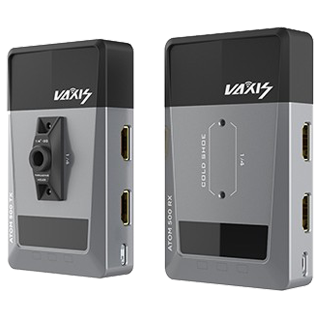 Bezdrôtová video súprava Atom 500 HDMI TX/RX od spoločnosti Vaxis je vybavená pripojením HDMI a umožňuje prenášať vizuálne bezstratové videosignály 1080p H.265 v pásme 5 GHz s oneskorením menším ako 80 ms a dosahom až 150 m pri priamej viditeľnosti. Okrem toho umožňuje multicasting cez Wi-Fi až na tri zariadenia so systémom iOS na monitorovanie a ponúka jasný stavový displej OLED, konektor USB-C na napájanie (kábel typu C je súčasťou dodávky) a aktualizácie, slot na batériu série L (batéria nie je súčasťou dodávky) a možnosť vypnutia chladiaceho ventilátora počas výroby.