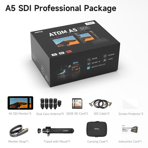 Profesionálny balík Vaxis Atom A5 SDI Monitor ponúka kompletné bezdrôtové video riešenie s dvoma 5,5" dotykovými monitormi TX/RX s rozlíšením 1920x1080, z ktorých každý ponúka jas 2000 cd/m², SDI/HDMI I/O s výstupmi so slučkou, dosah prenosu 1000', nahrávanie MP4 na microSD, dvojité batérie L500 a nástroje CINE OS vrátane 3D LUT a osciloskopov, spolu s deviatimi anténami, dvoma 32 GB SD kartami, dvoma SDI káblami, ochrannými fóliami na obrazovku, popruhom na monitor, rozťahovateľným statívom s držiakom a ochranným puzdrom na prenášanie.
