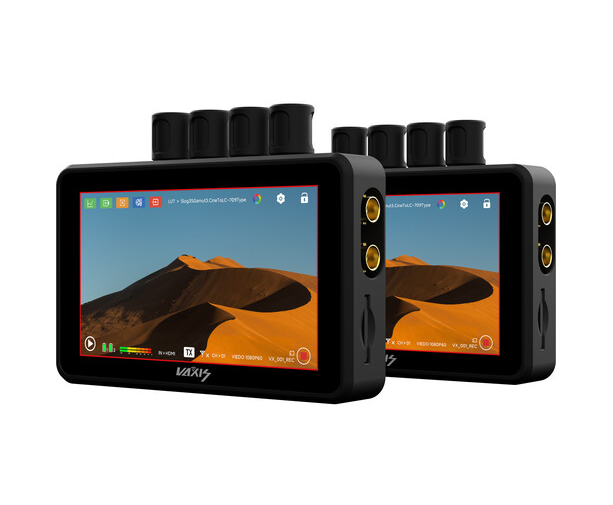 Profesionálny balík Vaxis Atom A5 SDI Monitor ponúka kompletné bezdrôtové video riešenie s dvoma 5,5" dotykovými monitormi TX/RX s rozlíšením 1920x1080, z ktorých každý ponúka jas 2000 cd/m², SDI/HDMI I/O s výstupmi so slučkou, dosah prenosu 1000', nahrávanie MP4 na microSD, dvojité batérie L500 a nástroje CINE OS…