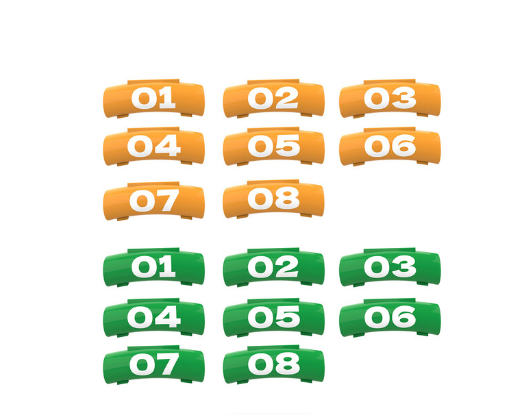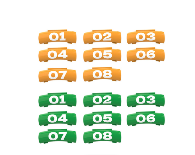 Balíček nálepiek Vaxis L220420 Litecomm obsahuje 16 očíslovaných samolepiacich nálepiek – 8 oranžových pre bodypacky pre hostí a 8 zelených pre hostiteľské ovládače – určených na jasnú identifikáciu a organizáciu až ôsmich vysielačov a prijímačov v bezdrôtovom interkomovom systéme Litecomm V1.