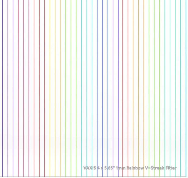 Filter VFX 4 x 5,65" Rainbow Streak Filter od spoločnosti Vaxis sa inštaluje do kompatibilných matných boxov a vytvára podlhovasté dúhovo sfarbené pruhy, ktoré sú symetrické a rozširujú sa horizontálne z bodových zdrojov svetla v scéne. Môže upriamiť pozornosť na konkrétnu časť záberu alebo vytvoriť vizuálne dramatický efekt. Filter je vyrobený z vodného bieleho skla pre optickú čistotu a vernosť farieb. Súčasťou balenia je polstrované puzdro na skladovanie a prepravu.