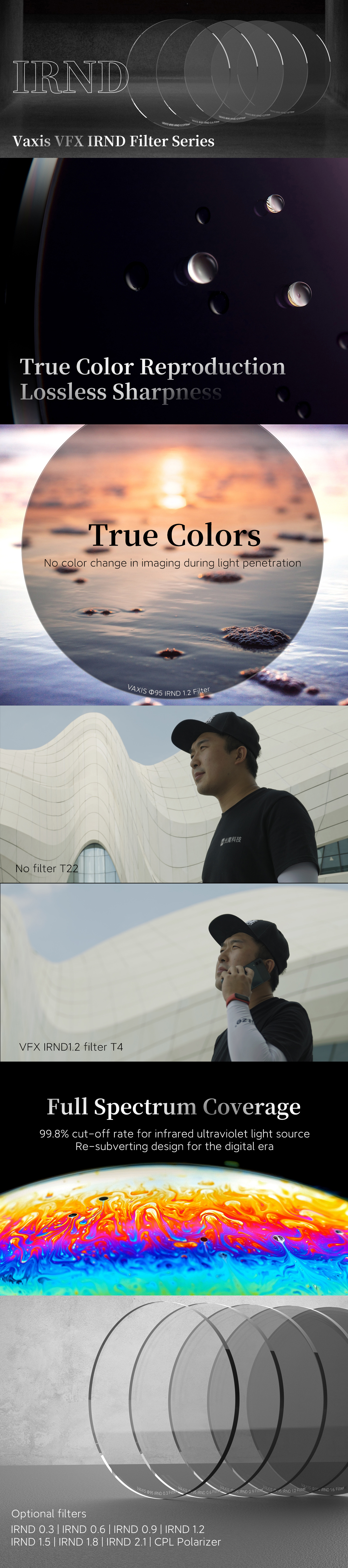 Vaxis VFX IRND filter 95 mm 1,5. Verná reprodukcia farieb, bezstratová ostrosť. Verné farby. Žiadna zmena farby pri zobrazovaní počas prenikania svetla. Celospektrálne pokrytie. odrezanie 99,8 % pre zdroj infračerveného ultrafialového svetla. Opätovná subverzná konštrukcia pre digitálnu éru.