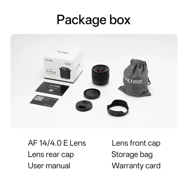 Objektív AF 14 mm F4.0 Air je vybavený štandardným 58 mm závitom na filter, utesneným telom pre spoľahlivé fotografovanie vonku a odolným kovovým bajonetom pre dlhodobú stabilitu. Predný prvok je potiahnutý vrstvou odolnou voči vode a nečistotám, zatiaľ čo port USB-C umožňuje jednoduché aktualizácie firmvéru, aby bol výkon objektívu vždy aktuálny.