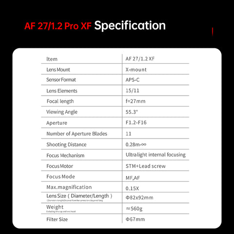 Objektív AF 27 mm F1,2 Pro je po objektíve AF 75 mm F1,2 Pro druhým základným objektívom s veľmi veľkou svetelnosťou zo série Pro, ktorý spoločnosť Viltrox uviedla na trh. Pokračuje v úžasnom ultravysokom rozlíšení série Pro a super veľkej clone F1,2 pre mimoriadne príjemný bokeh.