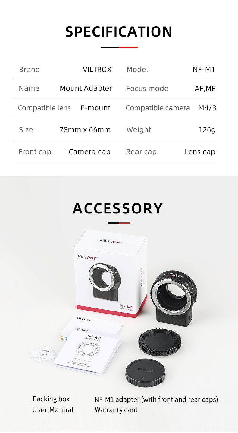 Viltrox NF-M1 Objektív s automatickým zaostrovaním Nikon F-mount na fotoaparát Micro Four Thirds M4/3 Panasonic Olympus