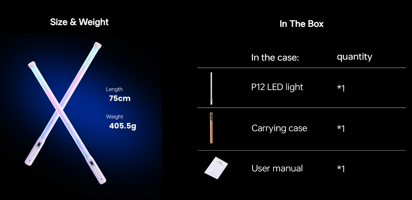 Vybavený 144 vysoko kvalitnými LED diódami a hodnotou CRI RA≥95, P12 zabezpečuje jasné a rovnomerné osvetlenie s presnou reprodukciou farieb. Jeho plná RGB schopnosť ponúka prístup k 36 000 farbám s presnou kontrolou odtieňa, sýtosti a jasu, zatiaľ čo nastaviteľný rozsah farebnej teploty od 2500K do 8500K uľahčuje prispôsobenie akémukoľvek osvetľovaciemu prostrediu.