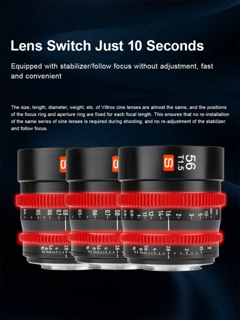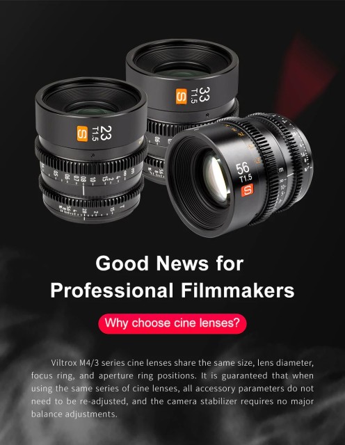 Filmové objektívy Viltrox MFT ponúkajú konzistentnú veľkosť/hmotnosť/váhu/kontrolu na jednoduchú výmenu v rámci kamerových súprav. Okrem toho sa môžu pochváliť veľmi dobrou svetelnosťou T/1,5, ozubenými clonovými/ostriacimi krúžkami, vynikajúcou ostrosťou, minimálnym dýchaním, nízkym skreslením a chromatickou aberáciou, nano vrstvou objektívu na minimalizáciu…