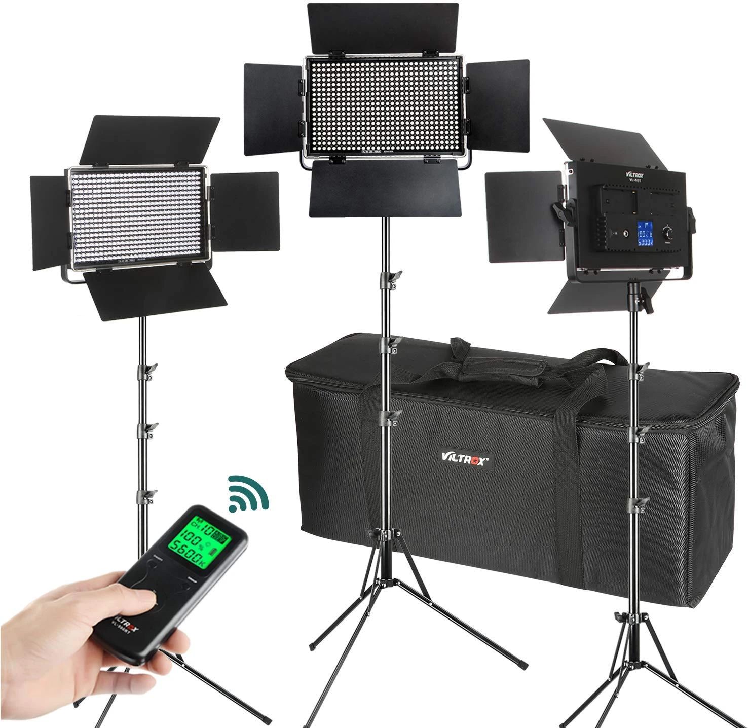Sada troch svetiel Viltrox VL-40T. Intenzívne 40W dvojfarebné LED svetlo s nastaviteľnou teplotou farieb (v rozsahu 3300-5600 K) a intenzitou (20-100 %; max. 4400 lm, 2600 lx/1 m). Ponúka možnosť bezdrôtového diaľkového ovládania (2,4 GHz, diaľkové ovládanie je súčasťou dodávky) a možnosť napájania pomocou batérií (NP-F960…