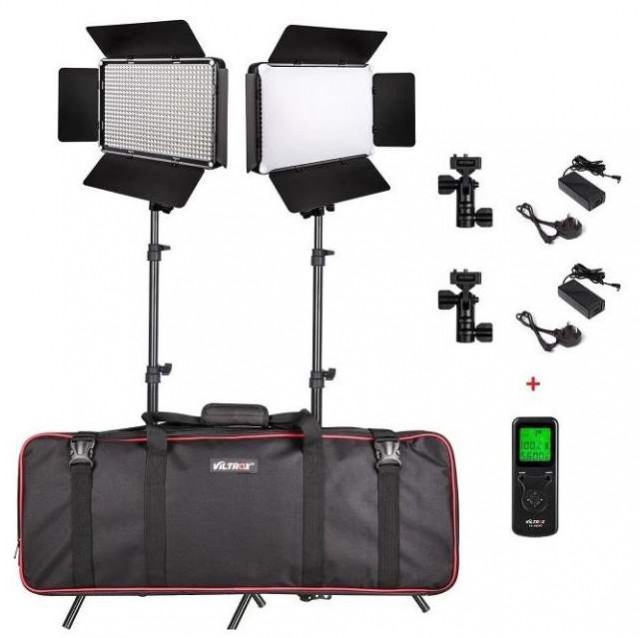 Sada dvoch svetiel Viltrox VL-D640T. 45W intenzívne dvojfarebné LED svetlo s nastaviteľnou teplotou farieb (v rozsahu 3300-5600 K) a intenzitou (20-100 %; max. 4800 lm, 4100 lx/1 m). Ponúka možnosť bezdrôtového diaľkového ovládania (2,4 GHz, ovládač je súčasťou dodávky) a možnosť napájania batériami (NP-F550 / F570 / F960 / F970, batéria nie je súčasťou dodávky) alebo externým zdrojom napájania (je súčasťou dodávky). Nastavenie parametrov uľahčuje prehľadný LCD displej. Rozmery 286x190x32 mm, hmotnosť 62 g.