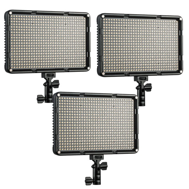 Sada troch svetiel Viltrox VL-D640T. 45W intenzívne dvojfarebné LED svetlo s nastaviteľnou teplotou farieb (v rozsahu 3300-5600 K) a intenzitou (20-100 %; max. 4800 lm, 4100 lx/1 m). Ponúka možnosť bezdrôtového diaľkového ovládania (2,4 GHz, ovládač je súčasťou dodávky) a možnosť napájania batériami (NP-F550 / F570 / F960 / F970, batéria nie je súčasťou dodávky) alebo externým zdrojom napájania (je súčasťou dodávky). Nastavenie parametrov uľahčuje prehľadný LCD displej. Rozmery 286x190x32 mm, hmotnosť 8,5 kg.