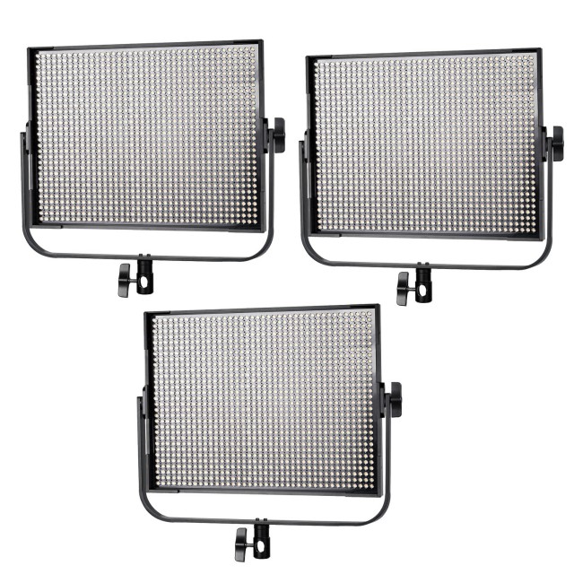 Sada troch svetiel Viltrox VL-D85T. Intenzívne 85W dvojfarebné LED svetlo s nastaviteľnou teplotou farieb (v rozsahu 3300-5600 K) a intenzitou (20-100 %; max. 9300 lm, 7030 lx/1 m). Ponúka možnosť bezdrôtového diaľkového ovládania (2,4 GHz, diaľkové ovládanie je súčasťou dodávky) a možnosť napájania pomocou batérie V-mount (batéria nie je súčasťou dodávky) alebo externého zdroja napájania (je súčasťou dodávky). Ľahko čitateľný LCD displej uľahčuje nastavenie parametrov. Rozmery 394x364x58 mm, hmotnosť 2860 g.