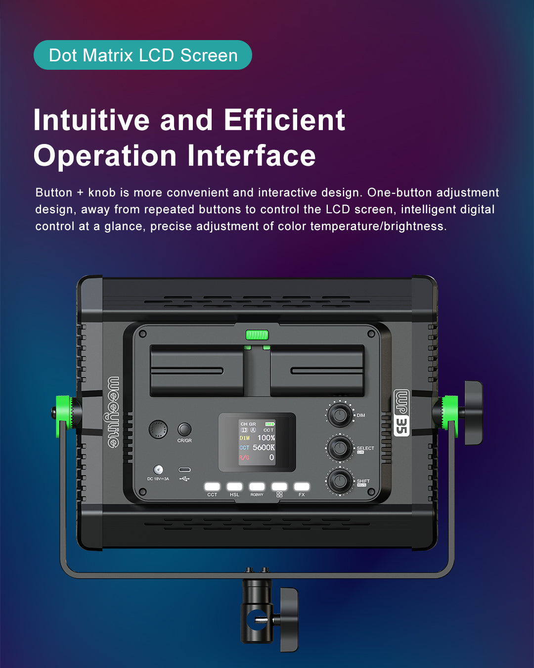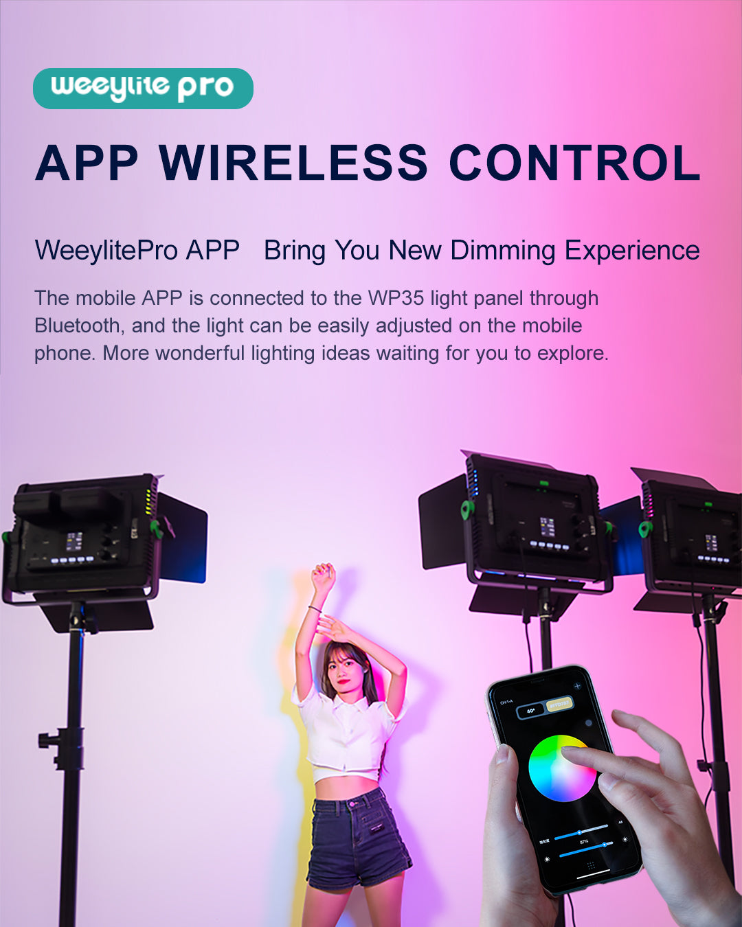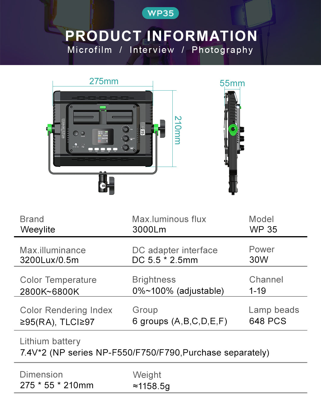 WP35 je profesionálne fotografické výplňové svetlo s vybranými guľôčkami s vysokým indexom zobrazenia a preferovaným RGB, nízkou spotrebou energie, stabilnou teplotou farieb a pomerom teploty farieb a jasu možno ľubovoľne nastaviť.Ľahko sa prenáša a je vhodné na fotografovanie v rôznych scénach a môže uspokojiť vaše potreby fotografovania viacerých scén.