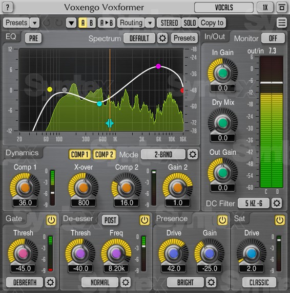 Voxformer je dále vybaven nástrojem pro odstranění sykavek (Sekce „Gate & De-Esser” > De-Esser) s volitelnou frekvencí a prahovou úrovní. Nechybí ani šumová brána (sekce „Gate & De-Esser” > Gate), která je stejně jako kompresor optimalizovaná pro maximálně snadné použití a perfektní výsledný zvuk. Odstraňovač sykavek si poradí s ostrým zvukem souhlásek s, z nebo c, šumová brána dokáže redukovat nádechy interpretů nebo šum v prázdných pasážích. Klasikou také známou z mixážních pultů je prezenční filtr (Sekce „Presence”), který může zlepšit srozumitelnost hlasu a oddělit jej od zvukového pozadí audio a video nahrávek. Specialitou je efekt saturace (sekce „Sat”) pro harmonické obohacení nahrávek, v tomto případě opět cílený na vokály.