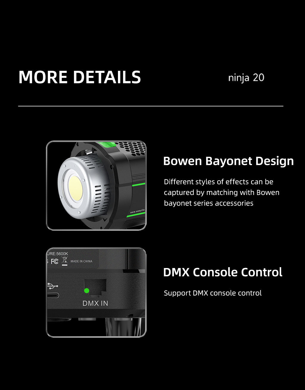 Weeylite Ninja 20 od spoločnosti Viltrox je svietidlo LED s denným svetlom 5600K a výkonom 200 W. Jeho technológia COB LED poskytuje výkon bez blikania s nadpriemerným hlukom a rozptylom tepla. Má držiak Bowens, ktorý je kompatibilný s najrôznejšími nástrojmi na tvarovanie svetla, a telo svietidla je celé kovové. Má chladič z oceľových rúrok a zabudovaný ventilátor na chladenie.
