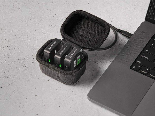 Vďaka integrovanej batérii je možné bezdrôtovú súpravu aj dobíjať. Umožňuje až dve úplné nabitia trojdielnej súpravy, takže vaša trojdielna súprava Wireless Go môže fungovať až 21 hodín. Vďaka pripojeniu USB-C máte tiež prístup k všetkým údajom systému, čo umožňuje prenášať nahrávky, upravovať nastavenia a aktualizovať firmvér bezdrôtovej súpravy.