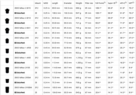 Kolečko ZEISS Lens Gear pro montáž dálkového ostření se upevňuje bez nářadí a dodává se ve čtyřech různých velikostech: mini (62 – 69 mm, 60 – 67 mm s gumovou podložkou GumGum), small (71 – 77 mm, 69 – 75 mm s gumovou podložkou GumGum), medium (78 – 84 mm, 76 – 82 mm s gumovou podložkou GumGum) a large (86 – 93 mm, 84 – 91 mm s gumovou podložkou GumGum). Součástí je také gumová podložka „GumGum” s adhezivním povrchem, která slouží ke zmenšení vnitřního průměru a/nebo k ochraně ostřícího prstence objektivu. Tabulka kompatibility s objektivy Zeiss Otus, Milvus a Loxia se nachází zde.