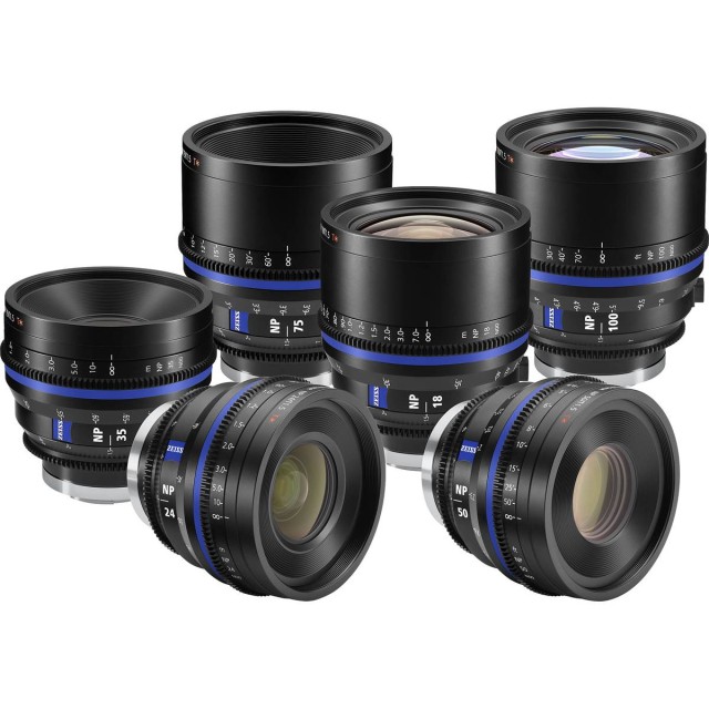 Súprava objektívov Zeiss Nano Prime 18 mm, 24 mm, 35 mm, 50 mm, 75 mm a 100 mm T/1,5 v pevnom puzdre. Vymeniteľný bajonet pre Sony E, metrická stupnica.