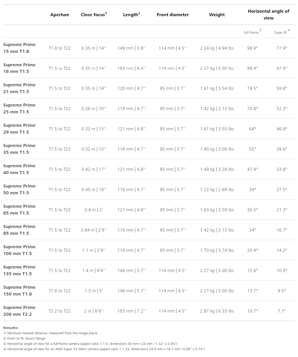 Rad špičkových filmových objektívov ZEISS Supreme Prime ponúka maximálnu konzistenciu všetkých modelov: konzistentné pokrytie snímača, farby, svetelnosť (T1.5 na väčšine modelov), veľkosť, hmotnosť a umiestnenie ovládacích prvkov. Všetky objektívy tejto série spoľahlivo pokrývajú snímače FF (kruhová projekcia 46,2 mm), podporujú technológiu eXtended Data a vďaka "systému vymeniteľných bajonetov" sú kompatibilné s bajonetmi PL, LPL a EF (objektívy sa štandardne dodávajú s bajonetom PL a metrickým označením).