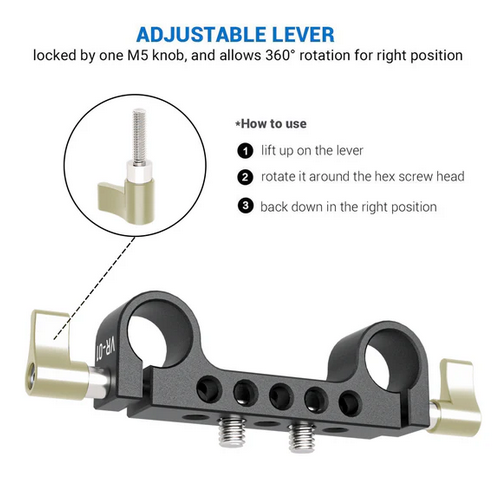 ZGCINE 15mm Railblock je vysokokvalitná svorka s dvoma tyčami kompatibilná so štandardnými 15mm nosnými systémami, vďaka čomu je ideálna pre kamery RED, zariadenia DSLR a iné filmárske zostavy. Je vyrobený z odolnej hliníkovej zliatiny a poskytuje bezpečné uchytenie, pričom umožňuje montáž ďalšieho príslušenstva prostredníctvom viacerých otvorov so závitom 1/4''-20. Pružinová západková matica zabezpečuje jednoduchú zmenu polohy, a to aj v stiesnených priestoroch, kde nie je možné úplné otočenie. Táto ľahká, ale pevná svorka zvyšuje flexibilitu a funkčnosť nastavenia vašej kamerovej súpravy.