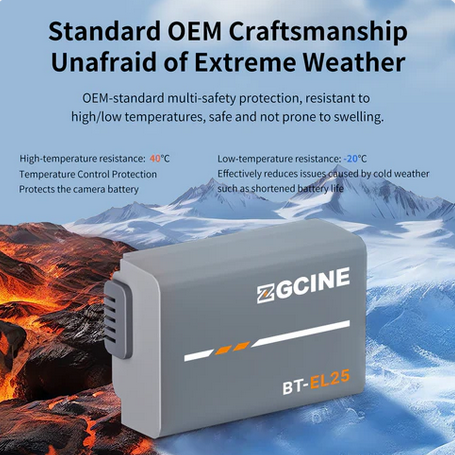 ZGCINE BT-EL25 je vysokovýkonná lítium-iónová batéria s kapacitou 1280 mAh, navrhnutá ako perfektná náhrada za batériu Nikon EN-EL25. Je plne dekódovaná, poskytuje úplnú kompatibilitu s fotoaparátom, zobrazuje presný stav nabitia batérie a podporuje nabíjanie vo fotoaparáte bez akýchkoľvek vyskakujúcich chýb alebo obmedzení. Je vybavená špičkovými lítium-iónovými článkami a pokročilým 8-vrstvovým ochranným obvodom (pred preťažením, nadprúdom, skratom, prehriatím atď.), čím zabezpečuje stabilný a bezpečný prísun energie. Pri použití s nabíjacími puzdrami radu ZGCINE PS alebo nabíjačkami radu PC umožňuje vysokorýchlostné nabíjanie a dosahuje 100 % kapacitu približne za 2 hodiny.