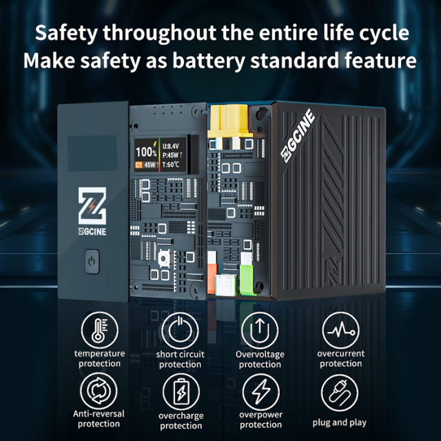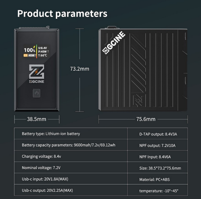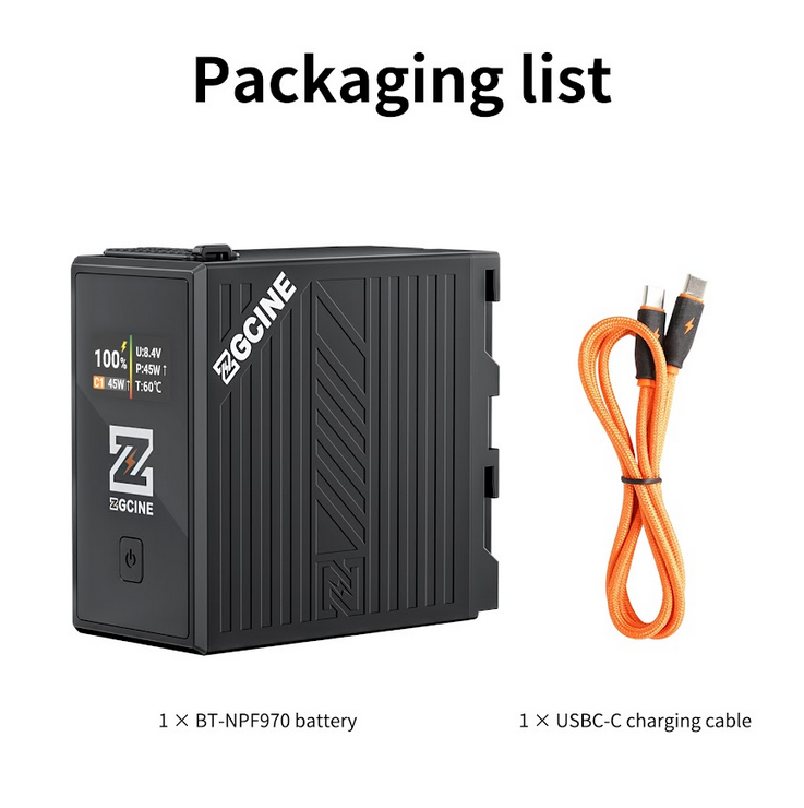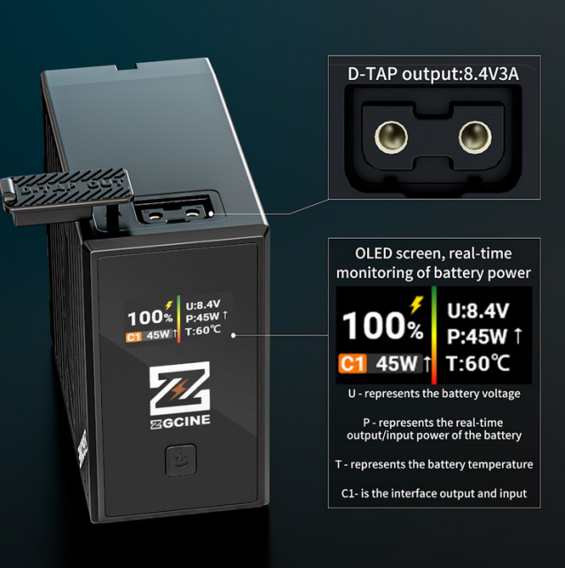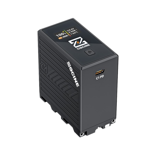 Batéria ZGCINE BT-NPF970 L Series poskytuje vysoký výkon v odolnej, kompaktnej forme s kapacitou 9600 mAh (7,2 V/69,12 Wh) lítium-iónovej batérie, podporuje rýchle nabíjanie PD a vybíjanie až do 36 W cez USB-C. Je vybavená výstupom D-TAP (8,4 V/3 A), výstupom NPF (7,2 V/10 A) a vstupom NPF (8,4 V/6 A) a napája širokú škálu filmových a vysielacích zariadení. Vstavaný OLED displej umožňuje monitorovanie stavu batérie v reálnom čase, napätia (U), výkonu (P), teploty (T) a stavu rozhrania C1, pričom jedným tlačidlom je možné prepínať zobrazenie (neaktívne počas nabíjania). Je navrhnutý tak, aby bol bezpečný počas celého svojho životného cyklu, a obsahuje ochranu proti prehriatiu, skratu, prepätiu, nadprúdu, spätnému prúdu, preťaženiu a preťaženiu. Je vyrobený z PC+ABS, spoľahlivo funguje v teplotnom rozsahu od -10 °C do 45 °C a disponuje funkciou plug-and-play pre hladkú integráciu do profesionálnych pracovných postupov.