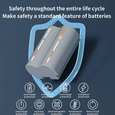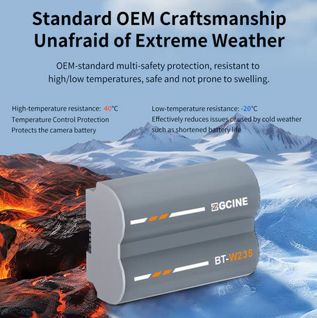 ZGCINE BT-W235 je plne dekódovaná náhradná batéria s kapacitou 2400 mAh (7,4 V) od iného výrobcu pre fotoaparáty Fujifilm, ktorá zodpovedá originálnej batérii NP-W235 veľkosťou a výkonom – bez varovaní, plná komunikácia s fotoaparátom – a zároveň ponúka rýchle nabíjanie (plné nabitie za ~2 hodiny s nabíjačkami ZGCINE PS/PC) a robustnú 8-vrstvovú bezpečnostnú ochranu pre spoľahlivé a dlhé fotografovanie.