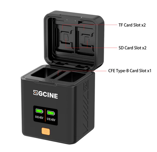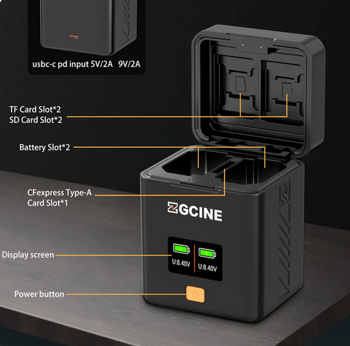 Nabíjacie puzdro ZGCINE pre batériu Fujifilm NP-W126S je kompaktné, multifunkčné puzdro, ktoré podporuje vstup/výstup USB-C PD, má vyhradené sloty pre karty SD, TF a CFE typu B a displej OLED na zobrazenie stavu.