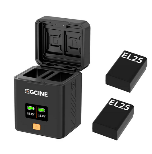 Nabíjacie puzdro ZGCINE pre batériu Nikon EN-EL25 ponúka vstup/výstup USB-C PD, viacero slotov na karty a prehľadný displej OLED na efektívnu správu batérie a médií.