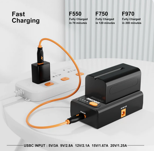 S rýchlym časom nabíjania iba 78 minút pre F550, 120 minút pre F750 a 200 minút pre F970 vám táto nabíjačka zabezpečí, že budete vždy pripravení na ďalšie snímanie. Či už potrebujete napájať svoje vybavenie alebo rýchlo nabíjať batérie, táto nabíjačka na viacero použití je riešením, ktoré potrebujete.
