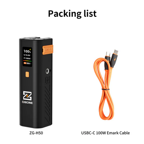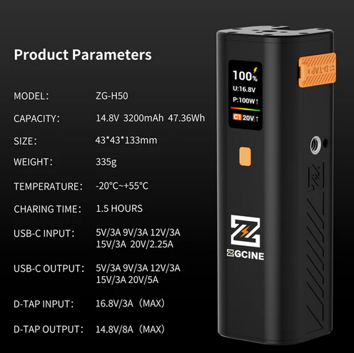 ZGCINE ZG-H50 je kompaktný mini batériový grip s kapacitou 52 Wh, ktorý poskytuje univerzálny zdroj energie pre profesionálne a spotrebiteľské zariadenia. Je vybavený 65 W USB-C PD vstupom/výstupom a portom D-Tap, ktoré sú všetky viditeľné na 0,96-palcovom OLED displeji. Jeho prenosný dizajn s viacerými upevňovacími bodmi z neho robí ideálne riešenie pre napájanie na cestách.