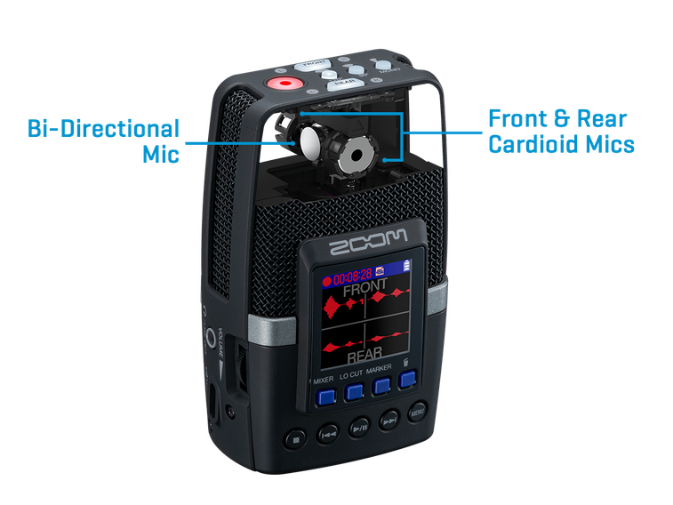 Vďaka dvom kardioidným mikrofónom smerujúcim dopredu a dozadu a jednému obojsmernému mikrofónu smerujúcemu do strán vám H2essential umožňuje vybrať si dokonalý vzor snímania pre každú nahrávku.