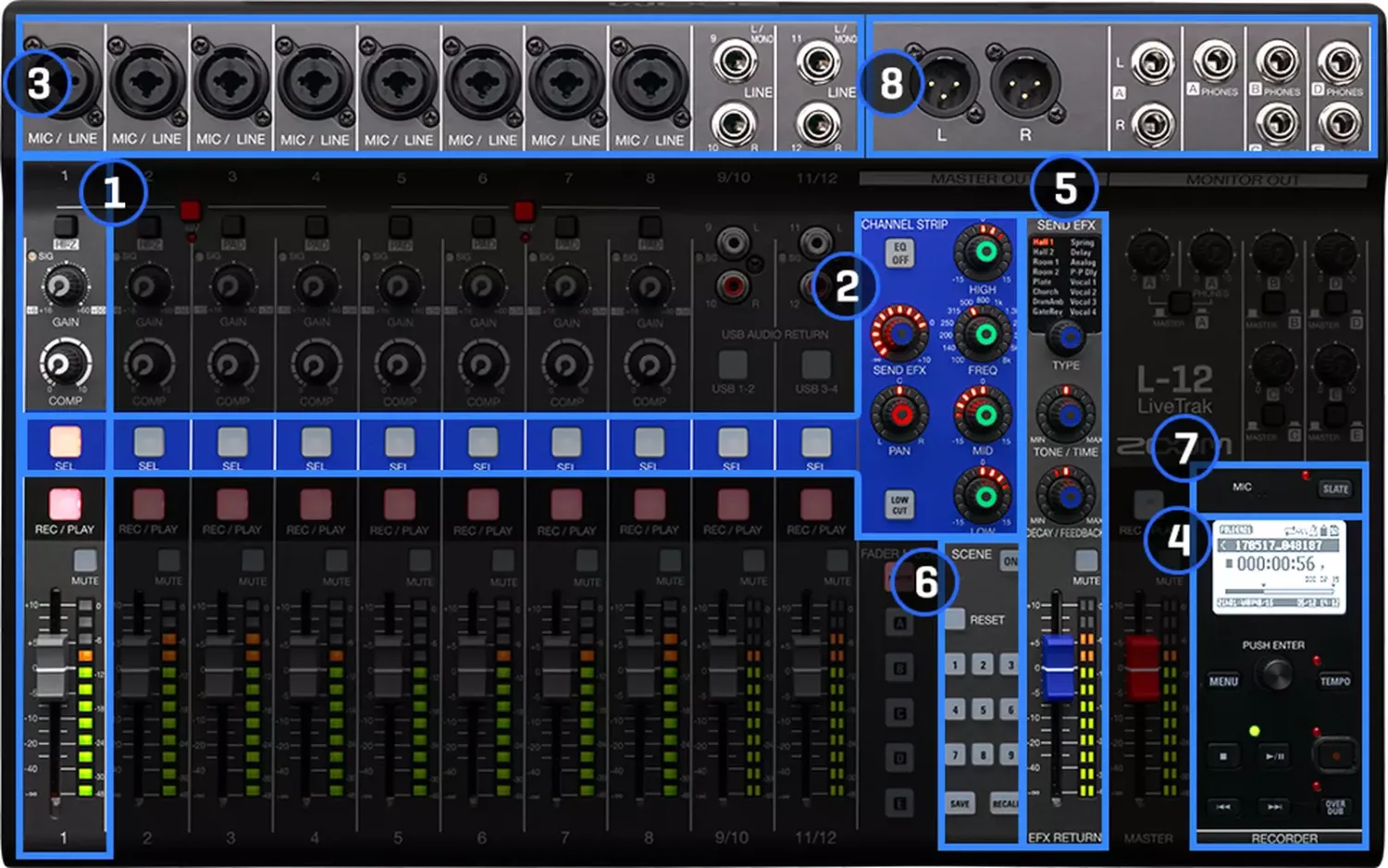 LiveTrak L-12 je jediný digitálny pult, ktorý umožňuje mixovať živý zvuk, súčasne nahrávať až dvanásť stôp a medzi tým dokonca vytvoriť päť nezávislých, voľne konfigurovateľných mixov pre slúchadlá. Konečne môžete mixovať, nahrávať a monitorovať na jedinom zariadení.